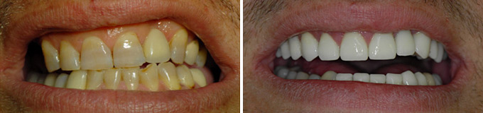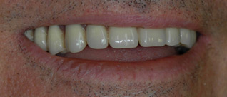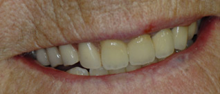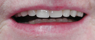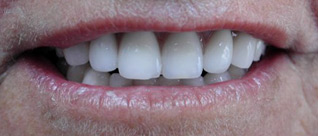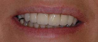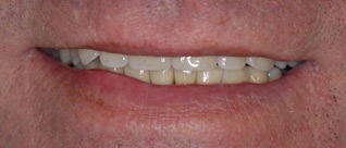 Les dents sont remplacées par des couronnes individuelles sur implants. Sourire final.
