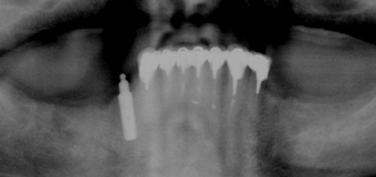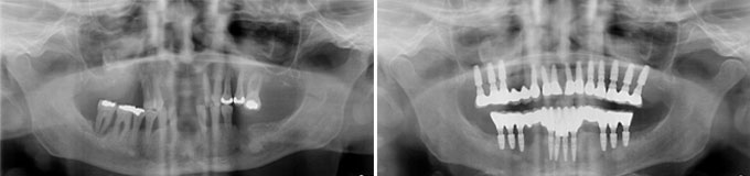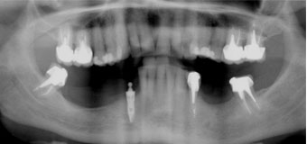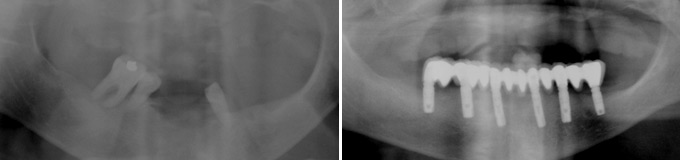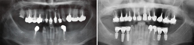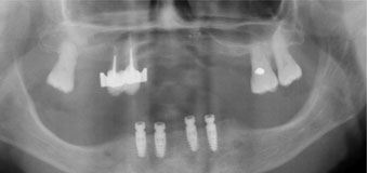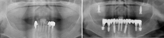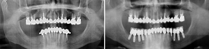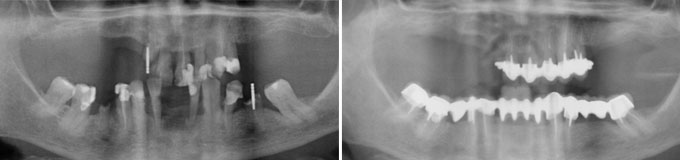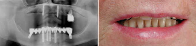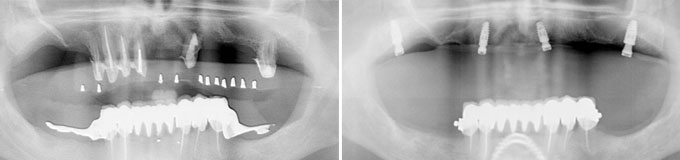 Dans ce cas, en bas 6 implants servent à réaliser un bridge fixe de 12 dents et en haut deux implants servent à stabiliser un appareil amovible.