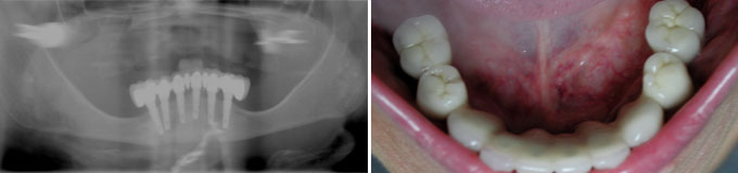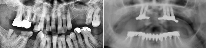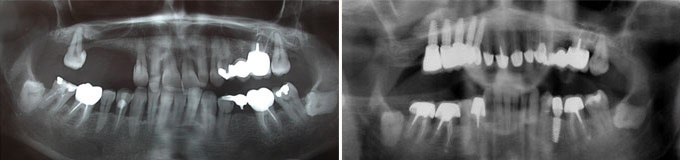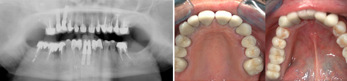 Toutes dents sont hélas perdues. Toutes les dents absentes sont remplacées par des couronnes sur implants.